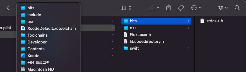 '/Application/Xcode.app/usr/include' 경로를 파인더를 통해 열어주면 됩니다.